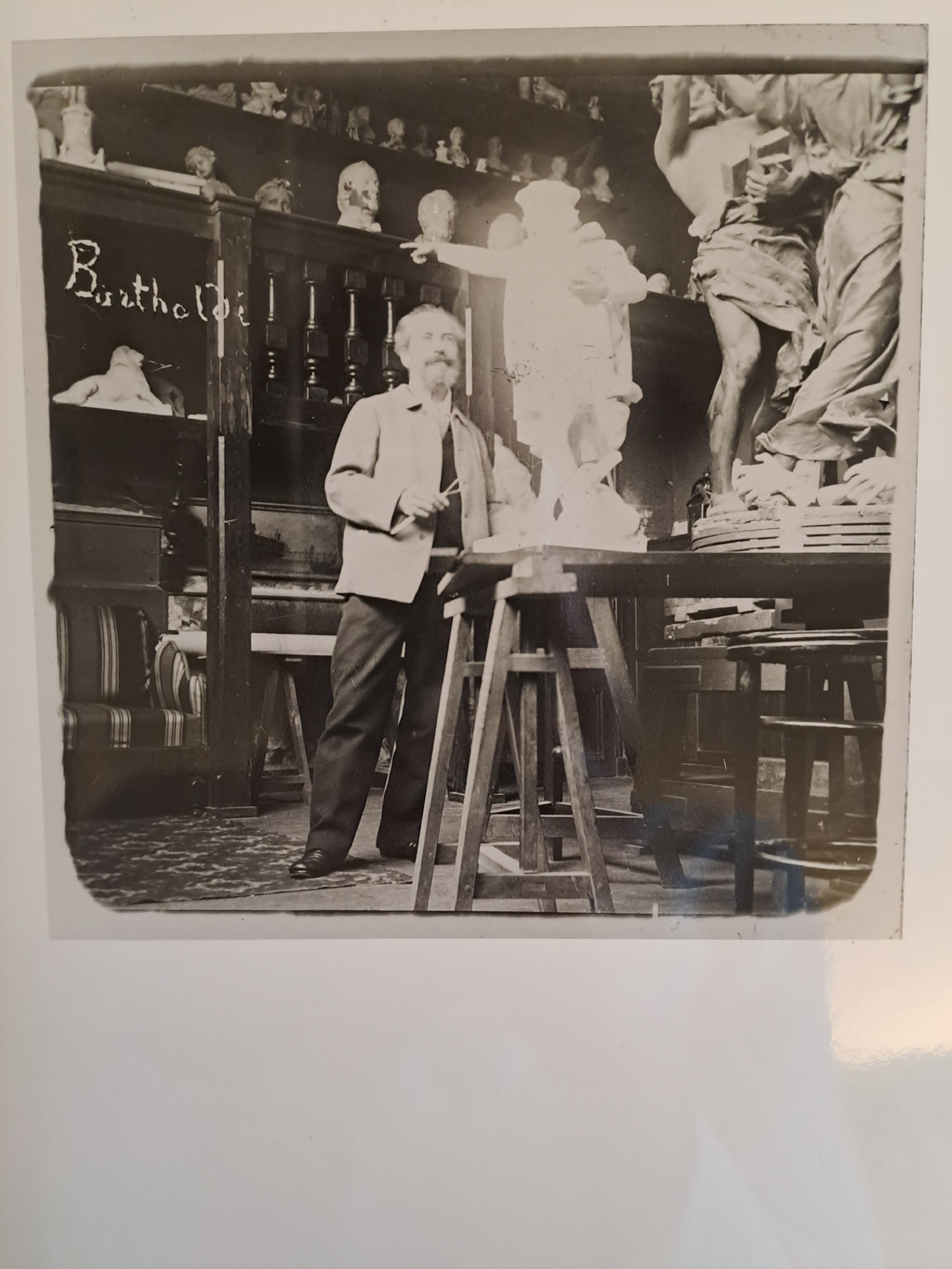 Photo de Bartholdi dans son atelier avec la maquette des Grands Soutiens du Monde au premier plan.